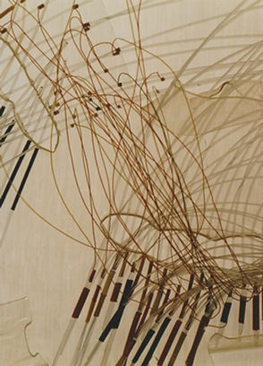 Le Plexiglas comme substance invisible, amorphe, mais sur lequel va pouvoir se poser l’idée, le désir de s’incarner. Tortillons d’ADN des fils de cuivre ; conduction d’énergie où rien n’est encore visible ; juste une transmission électrique porteuse du mystère en puissance de manifestation…